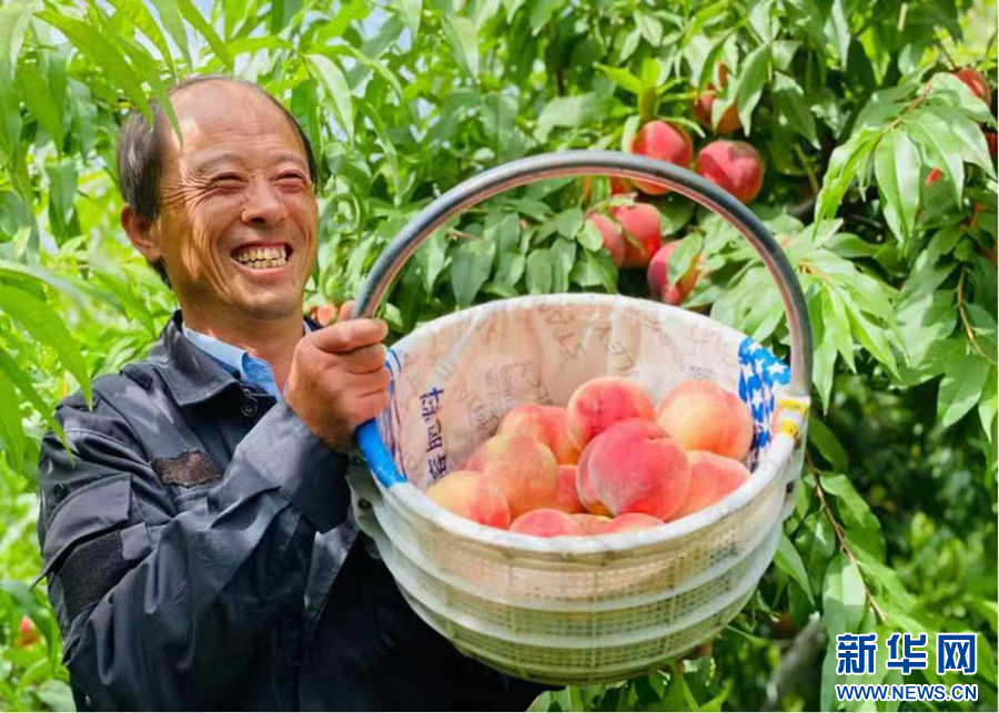 贵德县红柳滩村桃园经营者朱联产展示刚摘下来的桃子。(贵德县委宣传部供图)